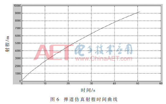 本次对比实验中,弹道仿真计算的预置参数为:射点与目标相距约9 200 m,横偏约600 m,弹药总计飞行约51 s。根据基于SoC FPGA的新型通用弹载计算机得到的结果绘制弹道仿真曲线如图6~图8所示。对于实时性要求较高的武器制导领域,本文提出的基于SoC FPGA新型通用弹载计算机完全满足计算性能要求。