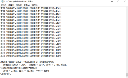 测试结果表明,在AGV运行的25分钟内,终端通过5G网络向外网服务器发送共计2047次数据包,实际接收2047次,丢失率为0%;平均时延48ms,最长时延157ms,最短时延27ms。在后期优化后,时延可望进一步降低到10ms量级。