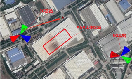 为保证本次测试顺利进行,中国联通网研院协调中国联通上海市分公司,预先启动并调试了上海汇众安亭北厂附近的2个5G基站,满足了对测试区域5G信号全覆盖的需求。厂区5G基站及本次测试区域如下图所示。