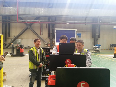 在项目现场,三方工程师们正将中国联通“先锋者一号”5G数据终端与昆山同日AGV系统进行整合并调试。