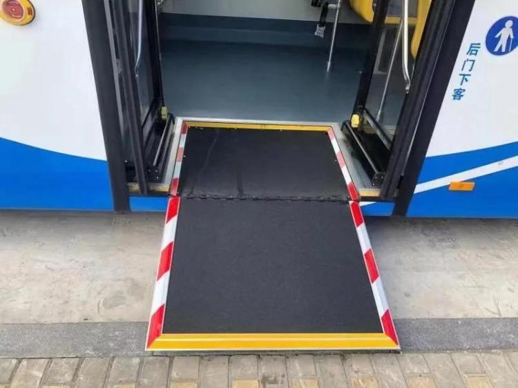 这次浦东91路和大泥专线更换的新车,在中门处增加了无障碍折叠踏板设施,遇有坐轮椅的残障人士或推婴儿车年轻爸妈准备上车时,只需将折叠踏板轻轻打开放下即可,从而达到让更多老幼病残人士无障碍出行的效果。