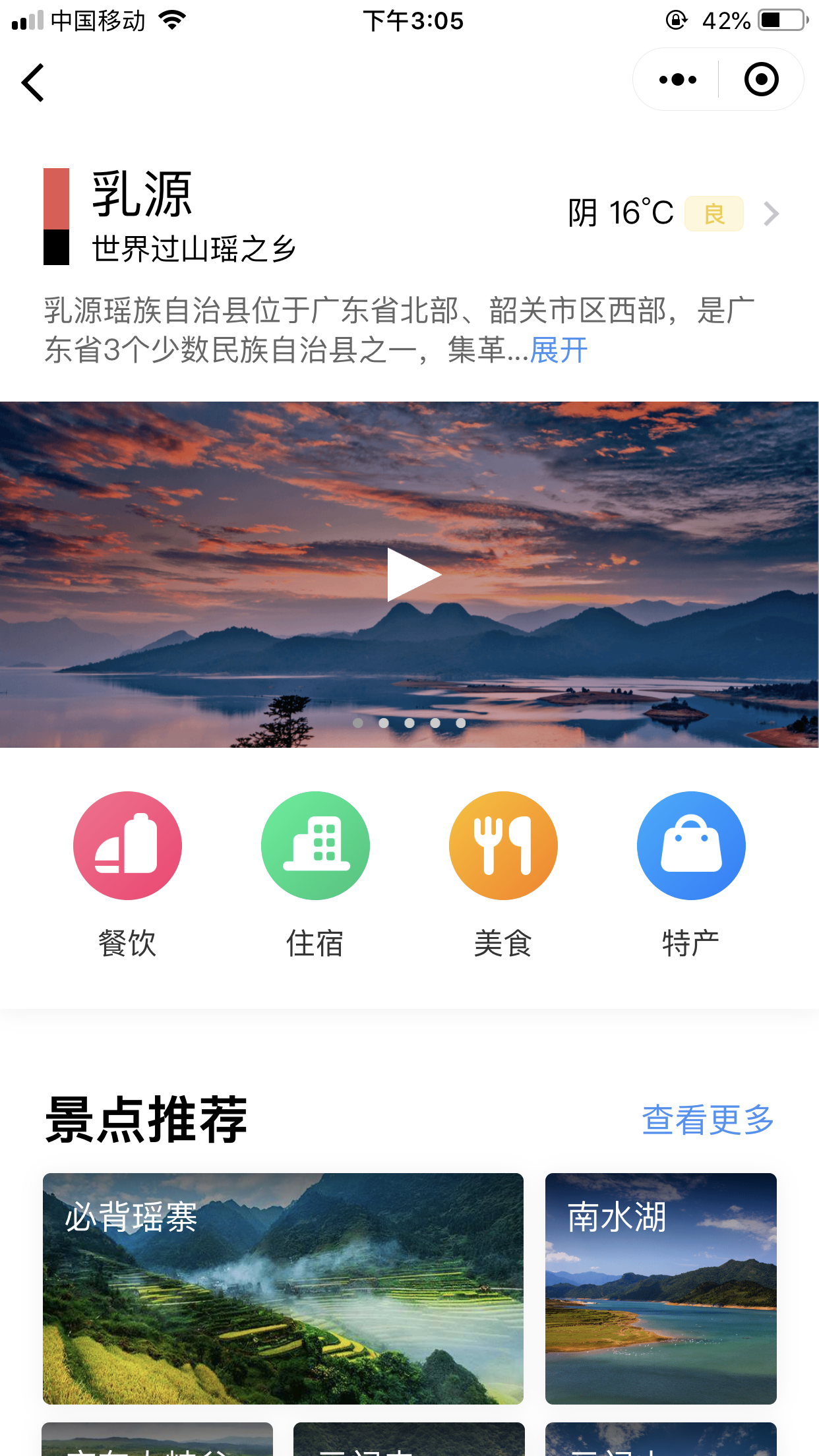 同时,“粤省事•韶关”还开通了“乳源少数民族旅游服务专区”,包含旅游攻略、景点信息查询、节庆活动查询等在内的共10个事项,整合包装乳源各主要景点、酒店、餐厅、美食、特产及定制路线和宣传视频。其中旅游景点和路线覆盖亲子、情侣等6大人群,涵盖周末游、户外体验、采风等3种主要出游方式,策划了如民族风情、自然风光、民俗活动等10种路线玩法,让用户“轻松游、自在游”。