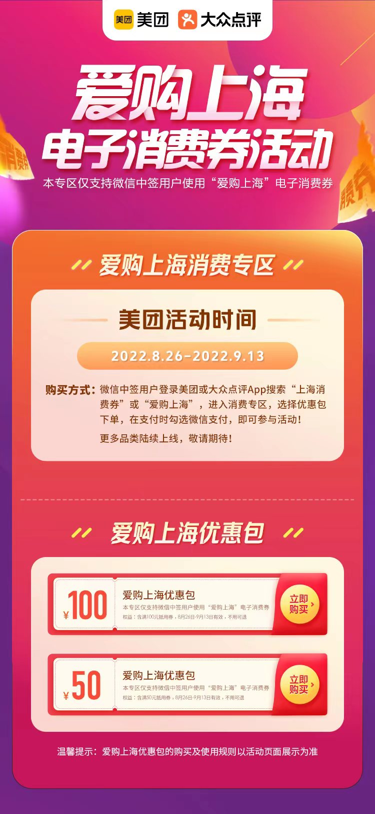 定位上海市的消费者登录美团App、大众点评App,搜索“上海消费券”或“爱购上海”,在爱购上海电子消费券活动专区中,仅支付50元、25元便可买到对应面值110元、55元的“爱购上海外卖优惠包”,用更优惠的价格享受到美团外卖提供的高品质外卖服务。