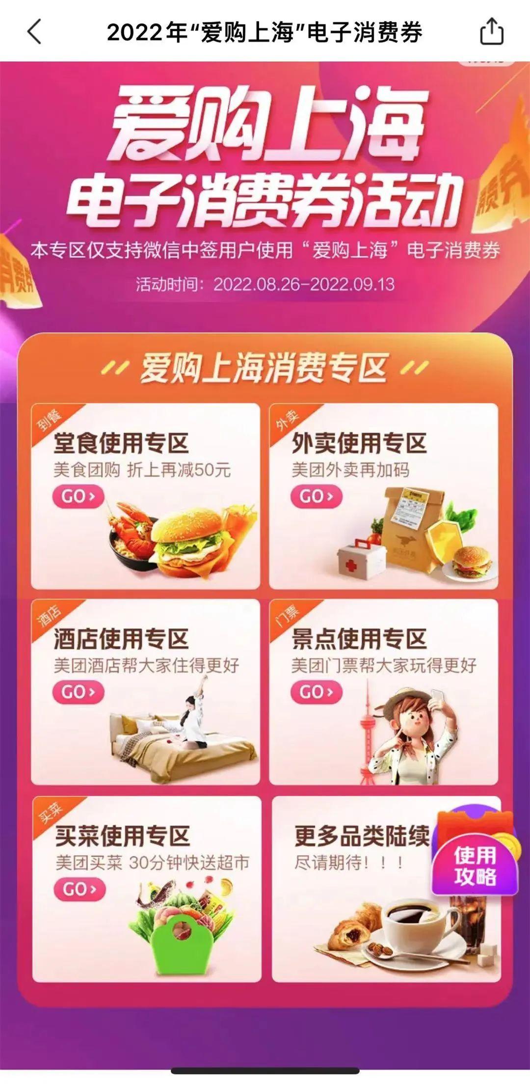为方便消费者使用,美团搭建“爱购上海”电子消费券优惠专区,上述8万家商户按照外卖、堂食、酒店、门票等分门别类,并设置50至110元金额不等的优惠包,消费者在支付时可选择微信支付中签的“爱购上海”电子消费券,享受折上折优惠。