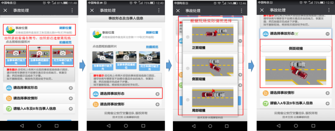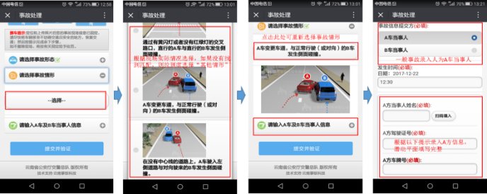 紧跟(1),点击“选择事故情形”后点击“选择”,在弹出的事故情形示意图及描述中根据实际情况选择,如果没有匹配则可把菜单拉到底选择“其他情形”。事故情形选择完毕后点击“输入A车及B车当事人信息”,然后选择A方或B方(一般录入人为A方),根据提示栏对应录入A方/B方当事人信息(如果之前当事人已在云南交通事故自助处理微信公众号上绑定过信息,则可以扫码填入),录完A方录B方,滑动手机屏幕填写完整。操作如下图: