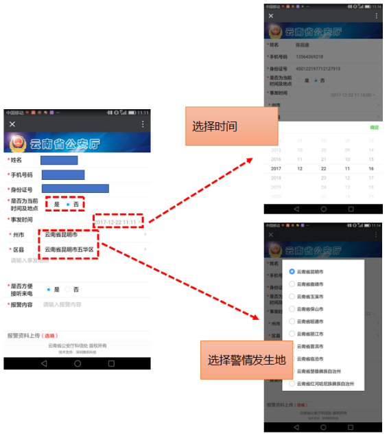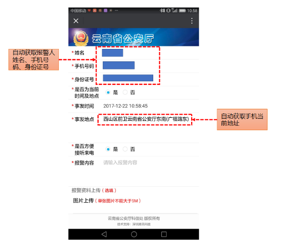 1.报警界面由报警人个人信息、事发时间、事发地点、报警内容组成。系统会根据实名核身注册的个人信息,自动填写报警人姓名、手机号码、身份证号信息,并根据GPS信息自动获取报警手机所在的地点。