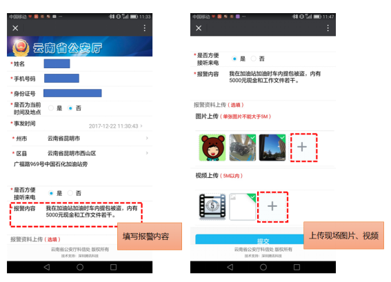 3.完成警情时间和地点填写后,请如实填写报警内容;如果方便接听电话,请在“是否方便接听来电”中选择“是”;如果有现场的图片、视频等资料提交警方,可以在报警内容下方报警资料上传栏目中点击“+”号,上传图片、视频资料。