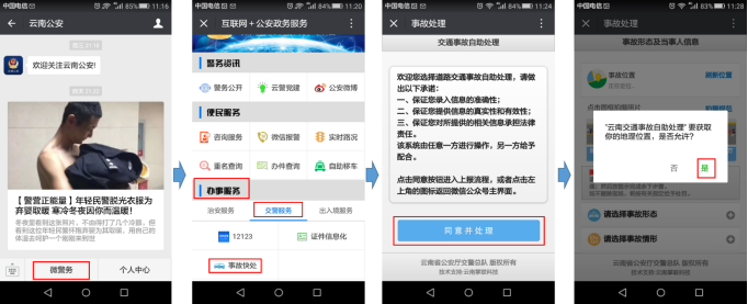 关注“云南公安”微信公众号后点击“微警务”进入云南公安微警务服务平台,找到“办事服务”,选择“交警服务”后点击“事故快处”进入事故自助处理(注意:第一次会弹出登录窗口,等一会,如果还没跳转,点击关闭后返回微警务界面重新点击“事故快处”即可),在弹出的提示窗口中阅读相关信息后点击“同意并处理”进入事故自助处理界面,并允许获取您的地理位置。操作如下图: