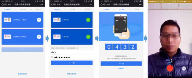 (2)紧跟(1),根据提示上传身份证正面和反面,上传成功并识别正确后选择“下一步”,在弹出的窗口中记住数字,然后根据提示信息点击“下一步”,手机调整为前置摄像头,然后开始录像并朗读刚才的数字,朗读完成停止录像,然后上传。操作如下图: