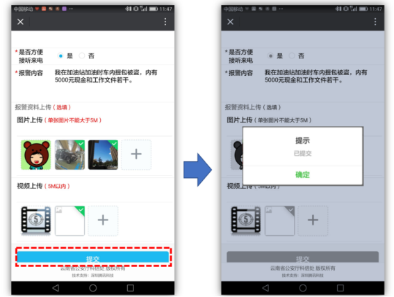 (三)提交警情。完成报警内容填写和资料上传后,请点击“提交”按钮,系统提交成功后出现提示。