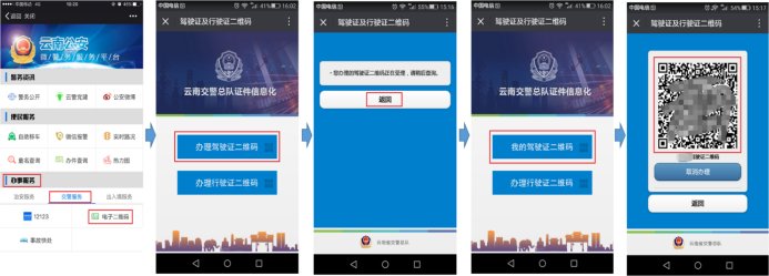 点击“微警务”进入云南公安微警务服务平台,找到“办事服务”,选择“交警服务”后点击“电子二维码”进入云南交警总队证件信息化主界面,然后点击“办理驾驶证二维码”后根据提示点击“返回”证件信息化主界面,过2-5分钟后再点击“我的驾驶证二维码”就会看到我的驾驶证二维码(该二维码已加密)。操作如下图: