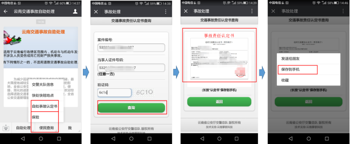 事故双方当事人可关注“云南交通事故自助处理”微信公众号,然后在“便民查询”中选择“自处事故认定书”,输入案件编号和身份证号,根据提示输入验证码后查询即可查看交警事故责任认定书(带交警大队电子签章),长按“认定书”保存到手机后可自行打印。操作如下图: