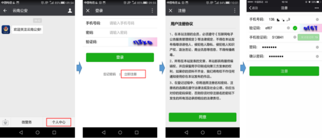 点击“个人中心”,点击“立即注册”后选择“同意”然后填写手机号码、验证码、点击“发送验证码”获取手机验证码、输入密码并再次输入密码确认,最后点击“注册”,提示注册成功。若已注册用户则直接输入手机号码、密码和验证码登录即可。操作如下图: