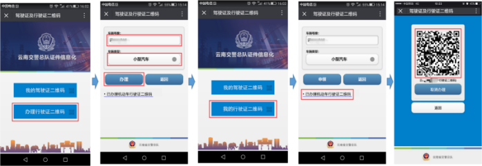在云南交警总队证件信息化主界面点击“办理行驶证二维码”,输入车牌号码(注:该车为本人名下),选择车型,然后点击“办理”,根据提示点击“返回”证件信息化主界面,过2-5分钟后若办理成功则系统自动变成“我的行驶证二维码”,点击进入后再点击“已办理机动车行驶证二维码”就会看到我的行驶证二维码(该二维码已加密)。操作如下图: