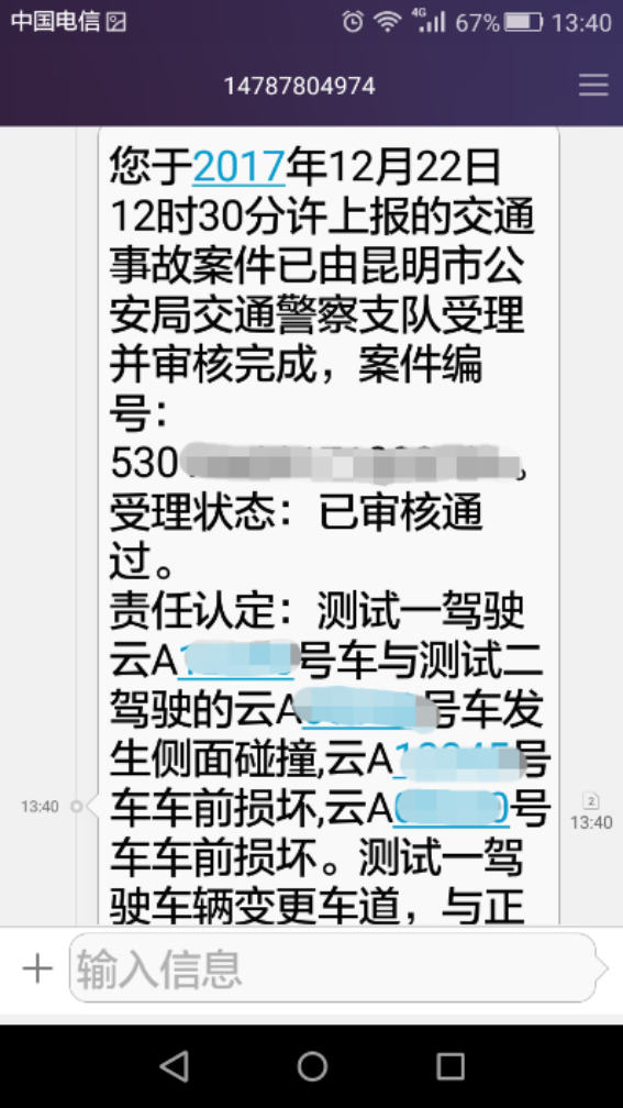 当事人完成事故自助处理上报后,对应的交警大队对事故进行审核处理,处理完成后系统自动短信信息通知事故双方当事人,短信内容包括事故处理大队、受理状态、责任认定、处理时间等。如下图: