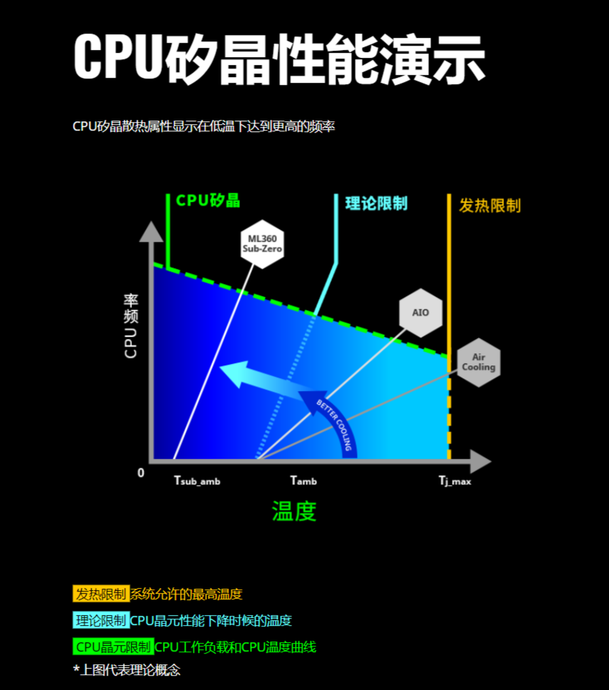 CPU内核温度越低,就能在同功耗甚至更低的功耗下,达到更高的频率,可简单理解为CPU都是低温高能,高温低能的产品。 平时大家无法体会到这个特性,是因为性能最强的风冷和水冷都无法做到让处理器低于室温,使其内核稳定的停留在到0℃~20℃的稳定温度区间。打个比方(非准确数值,只用于概念表达),假如让一颗CPU的某一个核心运行在5.5GHz的超高频,在TEC的压制下,可以将其控制在50℃,50W功耗,1.3V电压;如果没有TEC的大温差制冷,这个核心温度会急剧提升至90度以上,在高温下要维持内核的高频,电压会提升至1.45V,单核功耗提升至80W,最终导致CPU无法稳定高频运行。用TEC散热器,就相当于开启了一个特别定制的CPU舒适温区,让部分核心去冲击在传统散热条件下无法达成的高频率。