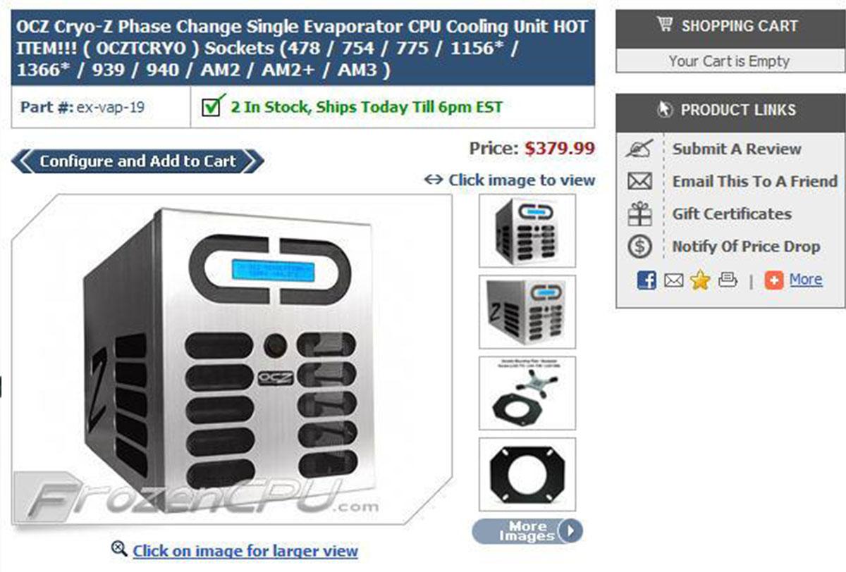 其实关于处理器的散热模式,一直并不局限于常见的风冷/水冷。为了解决温度问题,实现某些极端的目标(比如极限超频),极客们不断的尝试油冷,压缩机制冷,液氮,干冰等降温方法 。 曾经最接近零售市场使用的OCZ CRYO-Z系列压缩机能够通过相变制冷可以使蒸发器温度达到-45℃,甚至有国外发烧友通过自制三级压缩机系统,将温度降至了-196℃,已相当于液氮的蒸发温度。但是由于高昂的成本与复杂的使用方式,压缩机系统是不可能普至到家庭使用。液氮,干冰就更是仅针对极限超频这一特定目标的特殊手段而已,蒸发/升华速度非常快,只能带来短时间的极限效能,这些方式并不具备充分的可控性与可复制性。