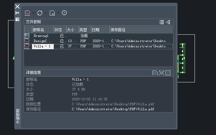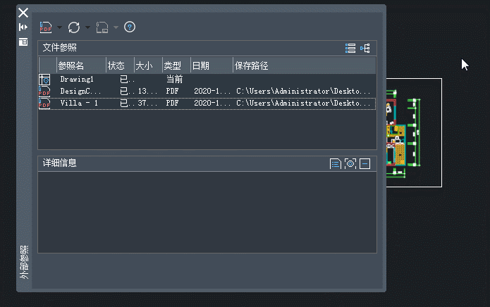 这个管理器可管理插入到CAD的各种外部参照,包括DWG、DWG、PNG以及PDF,今天我们主要介绍关于PDF的管理。