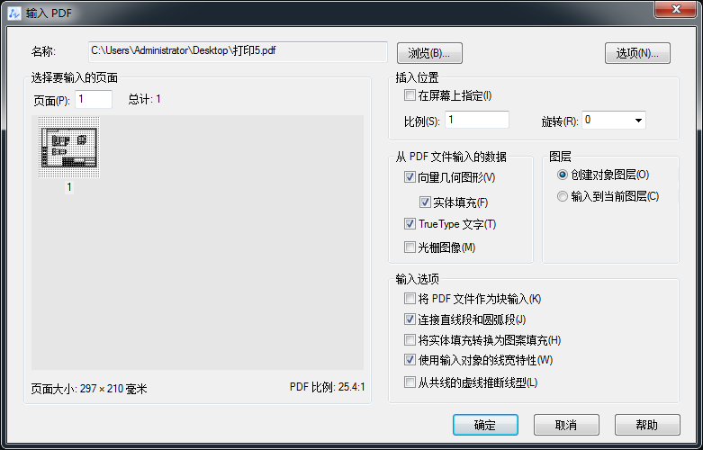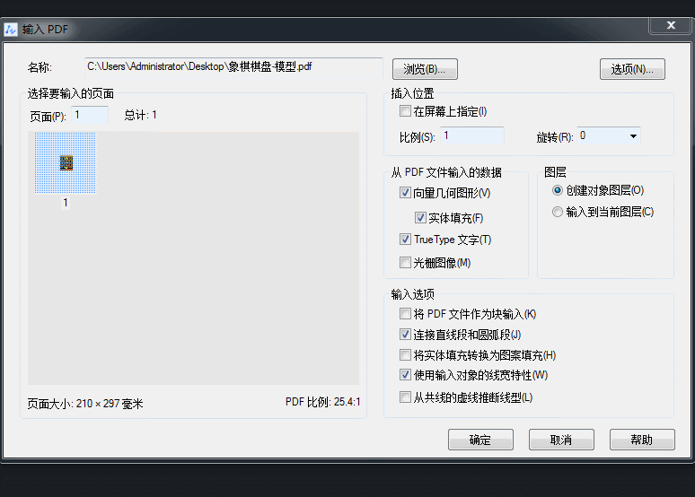 注意:输入数据的选择上,一定要勾选向量“几何图形”、“实体填充”和“TrueType文字”,如果不勾选,那么PDF的线条,填充和文字将不会输入到CAD中。