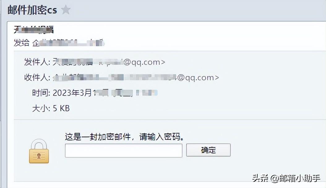 对于QQ邮箱的用户,点击邮件时会进入一个解密页面,输入邮件密码后即可查看邮件内容。解密后若有退出邮箱、清除浏览器cookie等操作,再次阅读邮件时需要重新输入密码(如下图所示);