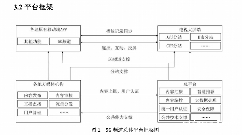 从内容上来看,《白皮书》表示5G频道内容呈现可在线性直播、智能推荐点播,以及智慧编排定制频道间自由切换。5G频道构建的全媒体传播体系将“打通”各级各类媒体机构,大屏端以总平台统一建设为主,提供内容智能推荐、频道智慧编排,发布推荐链接,实现线性直播、点播、频道定制及融合服务。小屏端(移动端)以各地自建为主,利用各台现有融媒APP植入总平台提供的5G频道SDK,从而增加5G频道模块,形成地方移动端的最终呈现。
