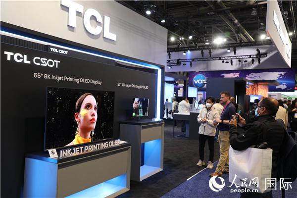 在2023年美国消费电子展上,人们驻足观看TCL推出的全球首款65英寸8K印刷OLED显示器。 人民网记者 李志伟摄
