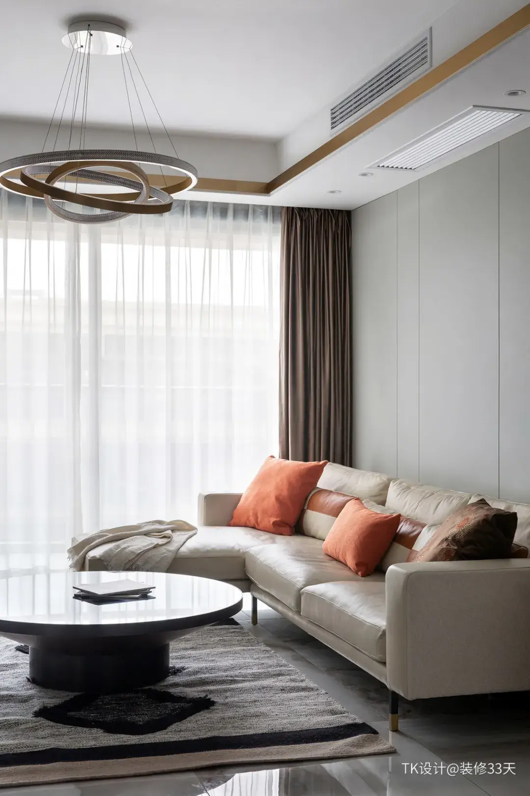 ▲ 沙发上的橘色系抱枕,点缀暖意,圆形茶几简约时尚
