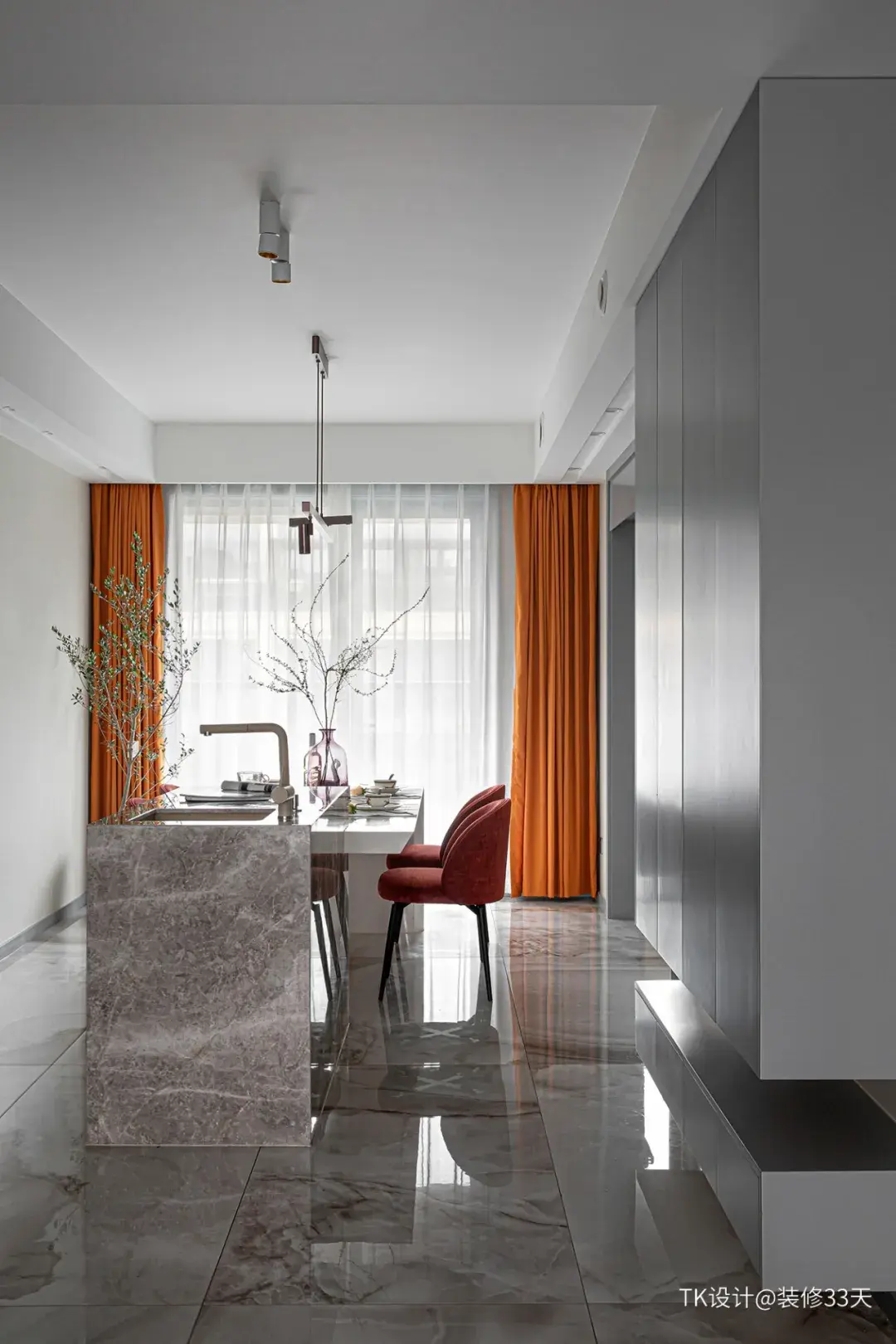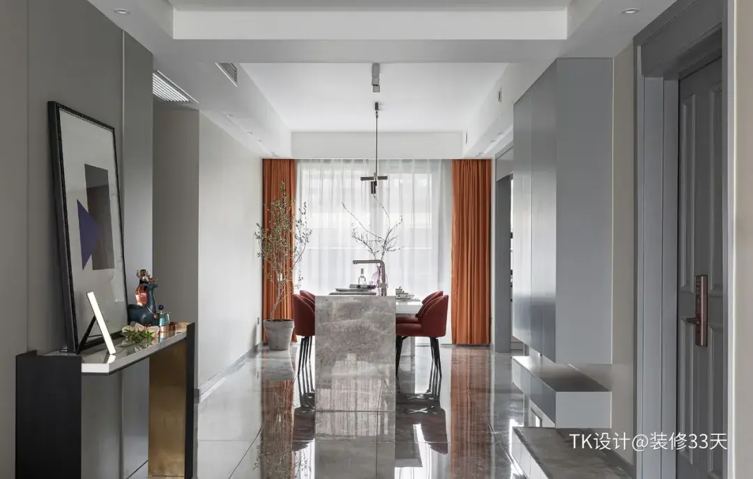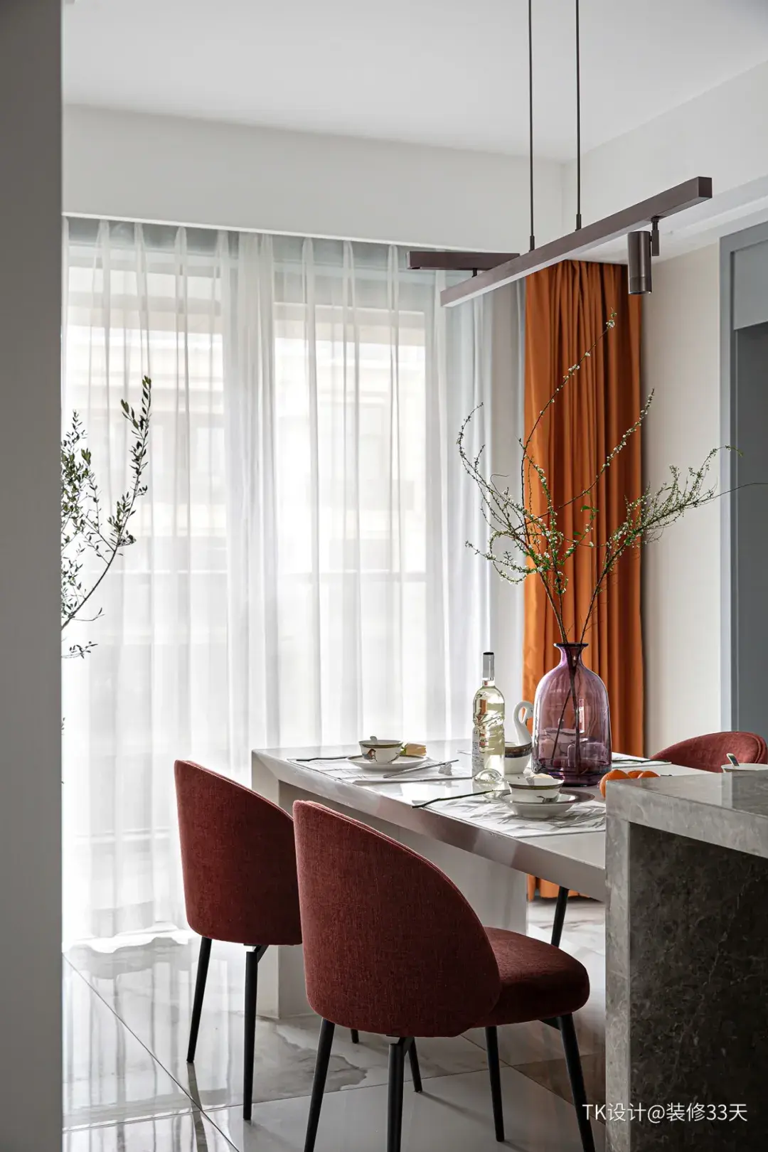 ▲ 活力橙的窗帘点亮了餐厅空间,冷与暖的碰撞恰到好处