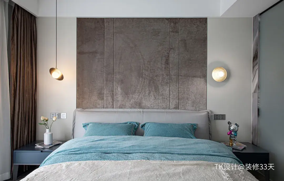 ▲ 主卧,整体灰色墙面与咖啡色软包搭配,低饱和度空间配色,简洁优雅