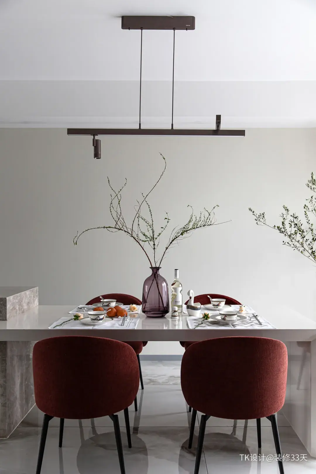 ▲ 酒红色的餐椅和现代吊灯的加入,在米白色的背景下彰显高雅品位