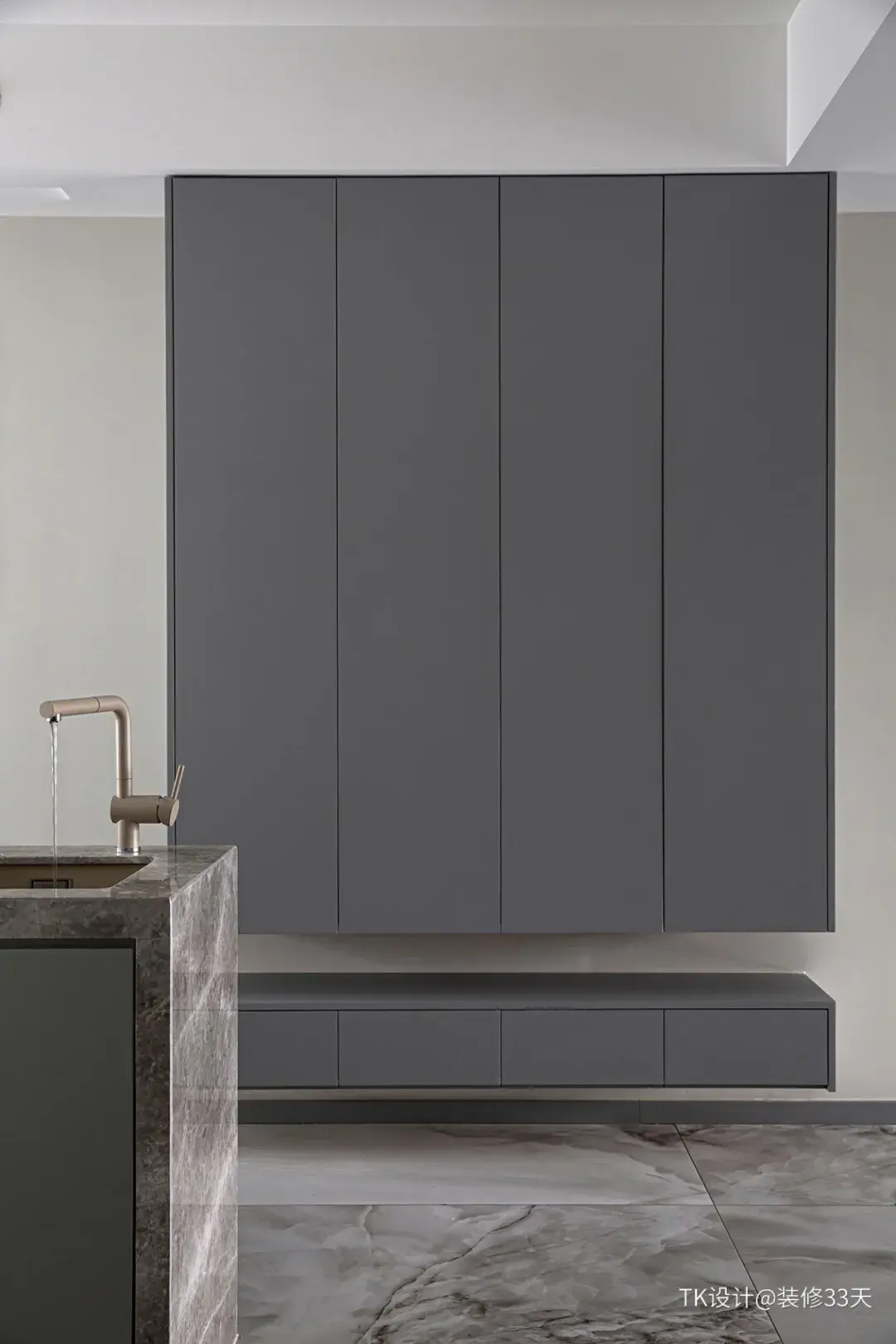 ▲ 建筑面积130平,本案的居住成员是夫妻二人和小宝宝,设计师讲究『以少胜多』的设计理念,以高级灰为主色调,用黄铜色点缀,打造舒适与美观并存的家居环境