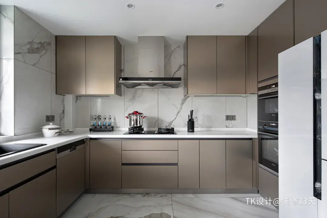 ▲ 厨房以白色大理石瓷砖为基础,大面积浅香槟色橱柜纳入大型厨电,