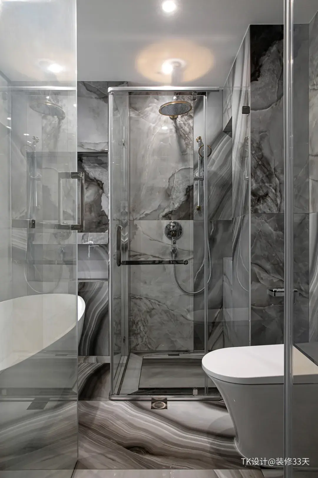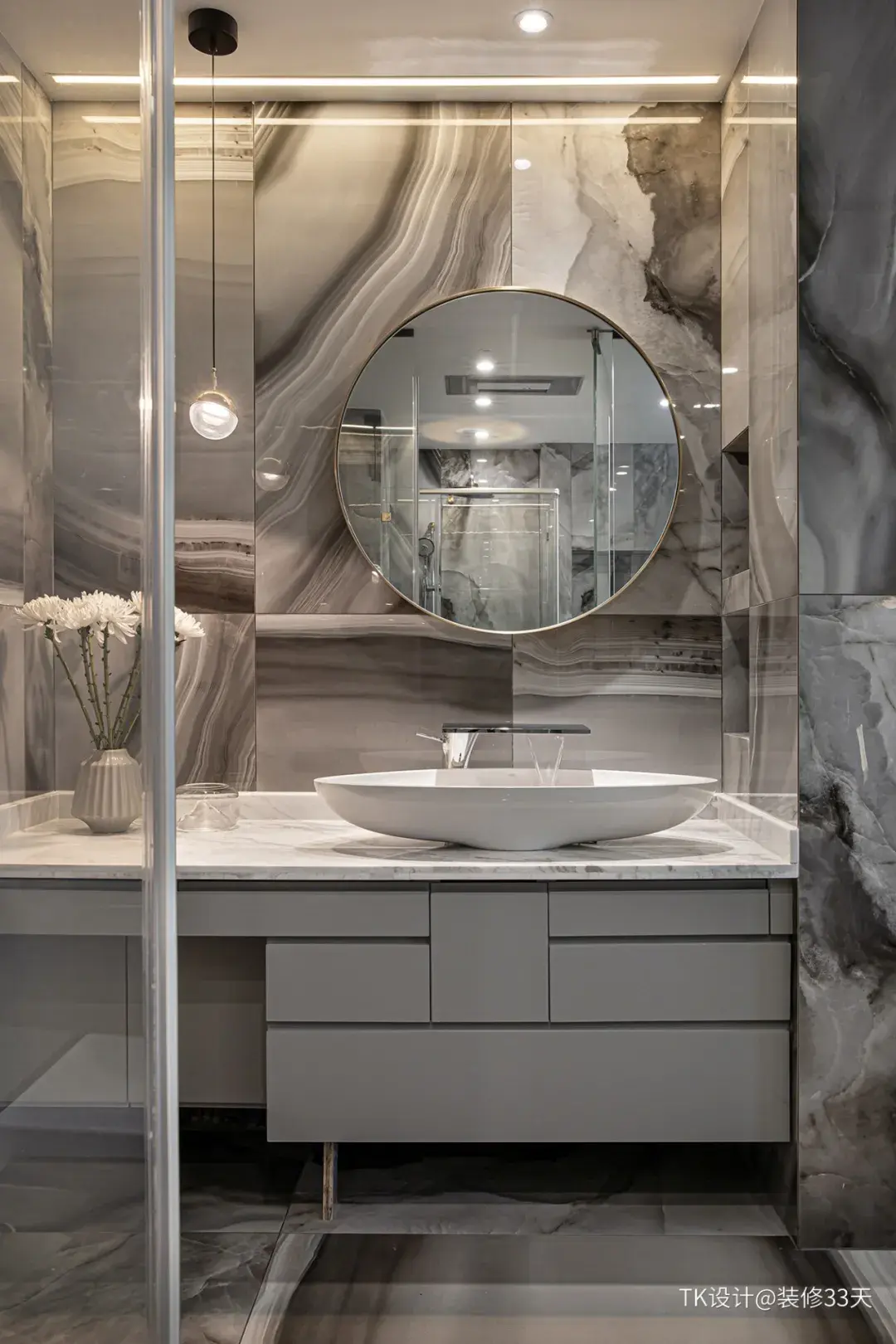 ▲ 主卫采用干湿分离,灰色花纹地砖延续到墙面,圆形台上盆与圆形浴室镜搭配,大气高级
