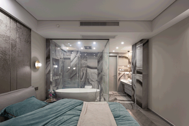 ▲ 主卫采用电子雾化玻璃替代隔墙,不占空间,采光通透,也能满足隐私需要