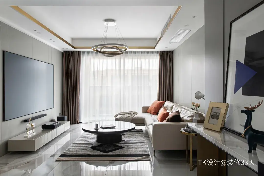▲ 进门左手边是客厅,电视和沙发背景采用灰色系,搭配柔和色系的沙发和电视柜,加入轻奢元素点缀