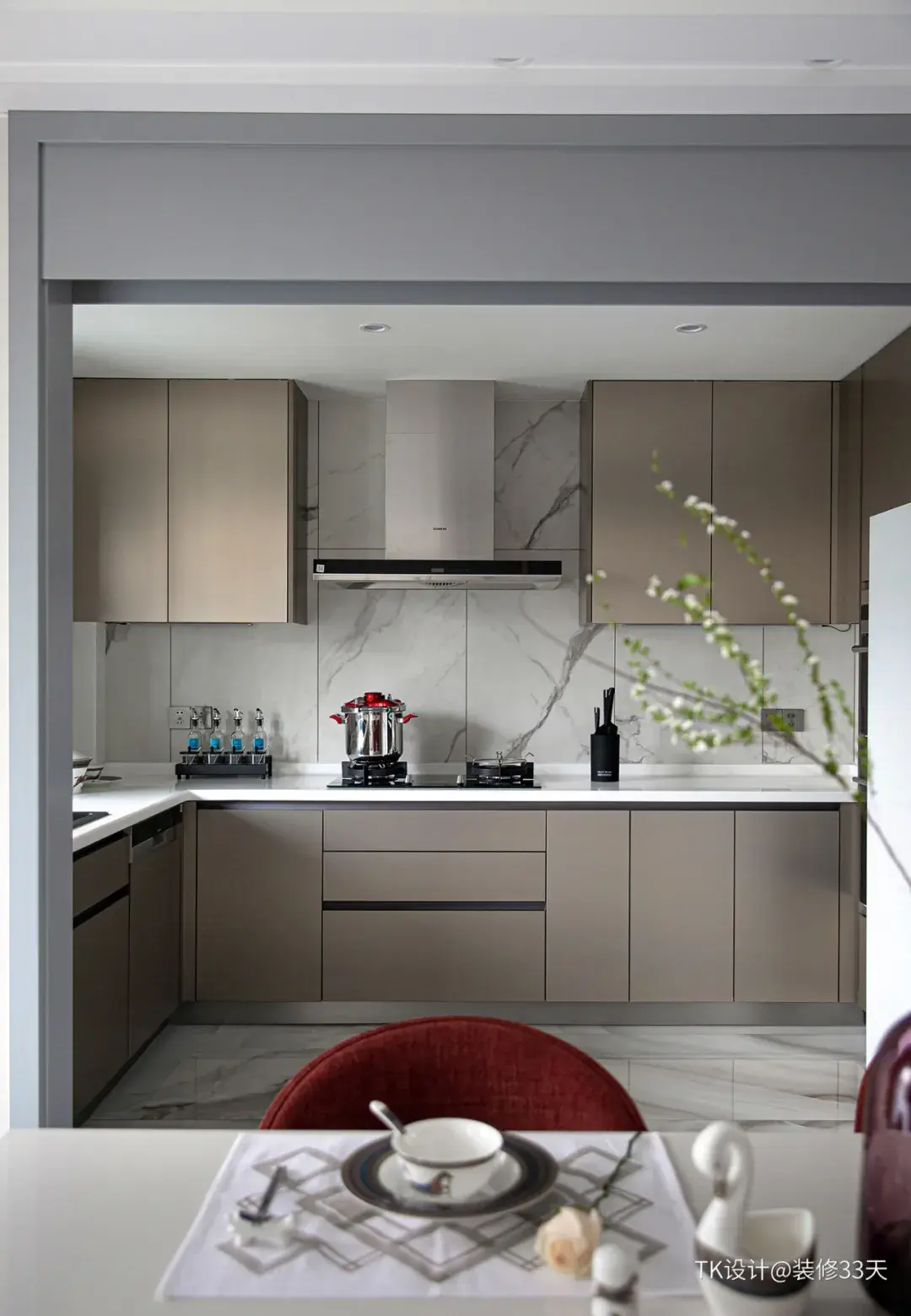 ▲ 人造石餐桌与云朵拉灰的大理石岛台合并,形成环绕式动线布局