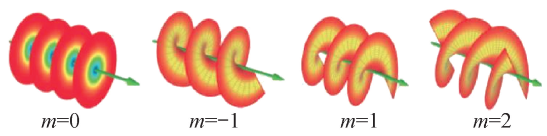 声波不仅可以携带动量,还可以携带角动量,我们将携带角动量的声场称为涡旋声场。 涡旋声场在传播过程中会产生波阵面绕轴的扭转,从而使其传播相位关于声束中心呈现螺旋变化的关系。定义拓扑荷数或声场阶数为一个波长的传播距离内波阵面发生扭转的次数,图8显示了拓扑荷数取不同值时声场的波阵面形态图。显然,当=0时,涡旋声场将退化为普通的平面波场。此外,拓扑荷数的正负表示波阵面的扭转方向。当拓扑荷数非零时,我们称声场携带轨道角动量(OAM)信息。与电磁波不同,流体中的声波是不存在偏振现象的,因而不存在自旋角动量(SAM),其轨道角动量就是最终的总角动量。