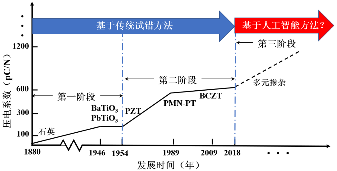 开展新型压电材料智能化多元寻优,是进一步提升压电材料性能、开发高性能压电器件的关键,无机压电材料即将迎来第三阶段发展,如下图所示。