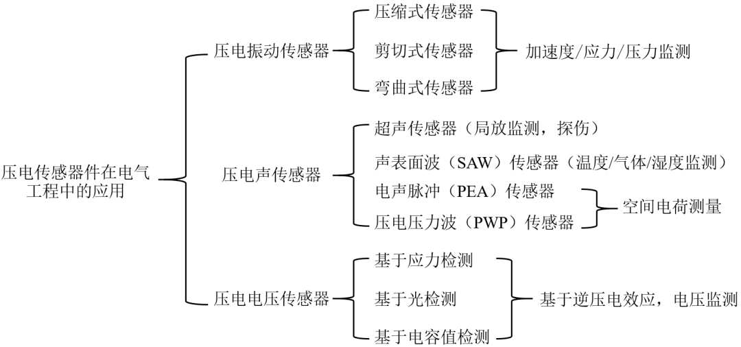 随后,概述了压电振动传感器、压电声传感器、压电电压传感器的实现原理,重点对压电传感器件在电力设备振动监测、放电检测、探伤、温度测量、电压传感等电气工程领域的实际应用进行了介绍,如下图所示。