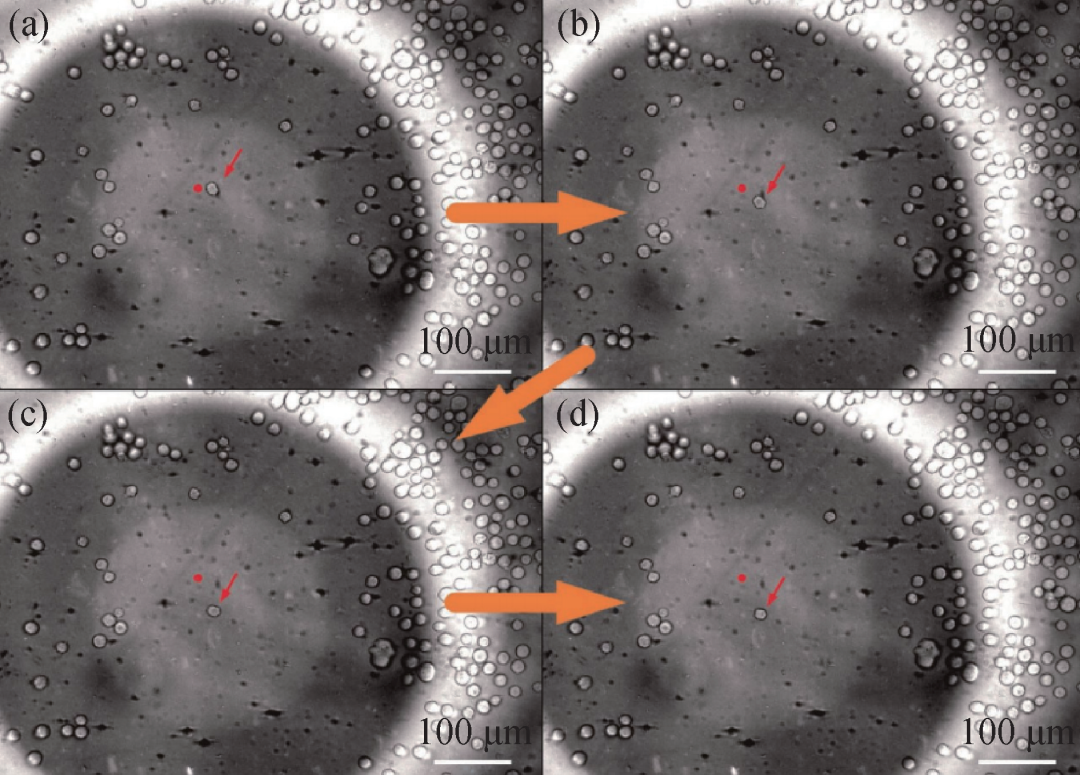 图6 利用高频超声实现对细胞的捕获。在换能器激发声场之前,细胞位于距离势阱中心 50 μm 处(a),当激发声场后,细胞受到辐射力的牵引作用向势阱中心移动(b),(c),最终在势阱中心处再次保持静止(d)