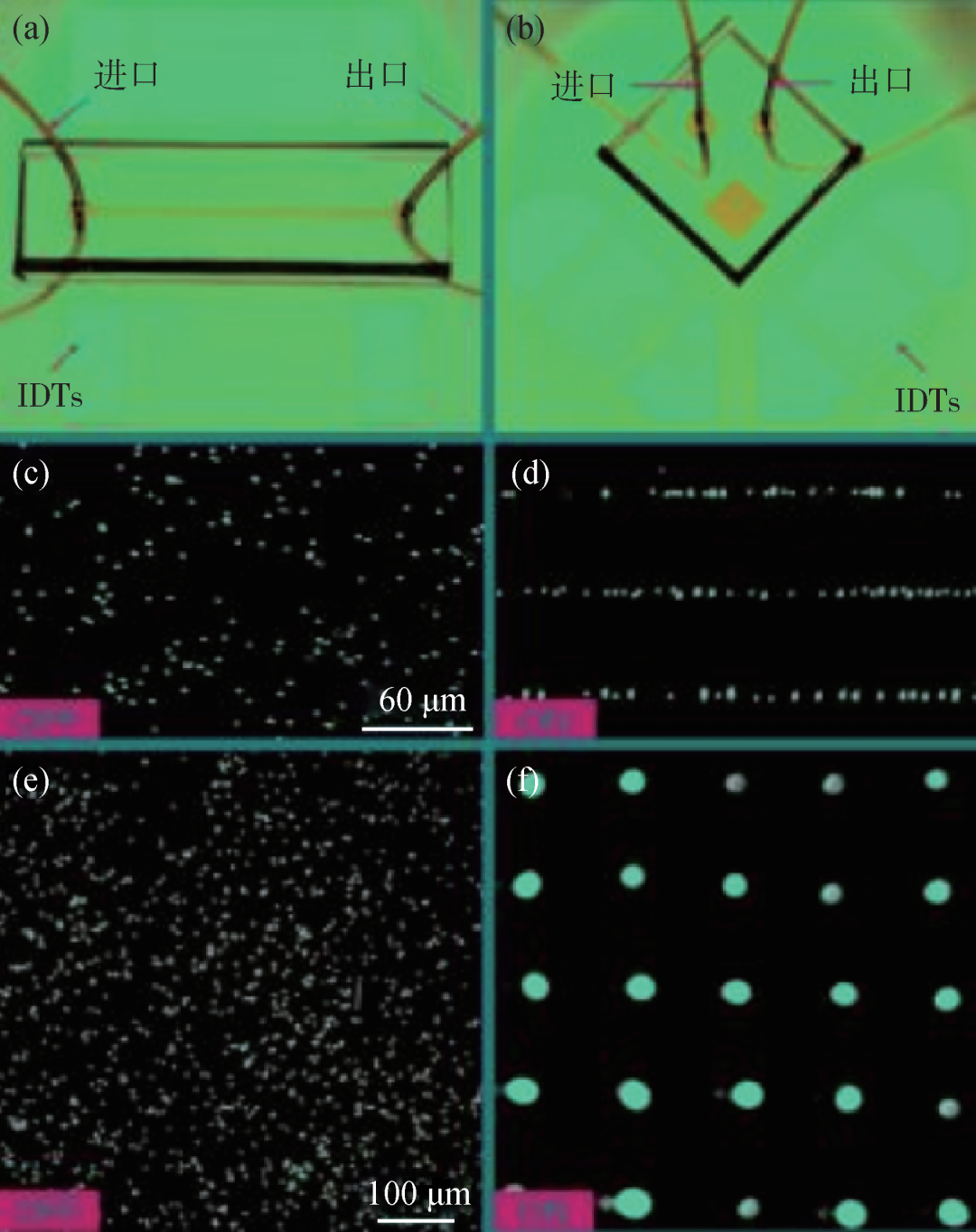 图5 利用声表面波实现对微粒的排列和操控,其中(a),(b)是放置在芯片上的声镊系统,(c),(d)和(e),(f)分别是驻波场作用下对微粒的一维和二维操控