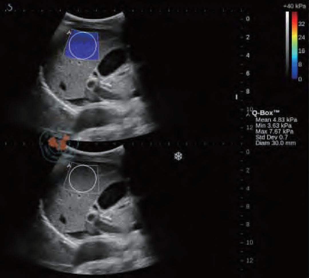 图12 慢性肝病患者的肝脏剪切波弹性成像及定量分析图。下图是原始的成像图,上图的蓝色区域则是在成像区域内选取直径为3 mm的圆形定量检测区域进行弹性模量的检测