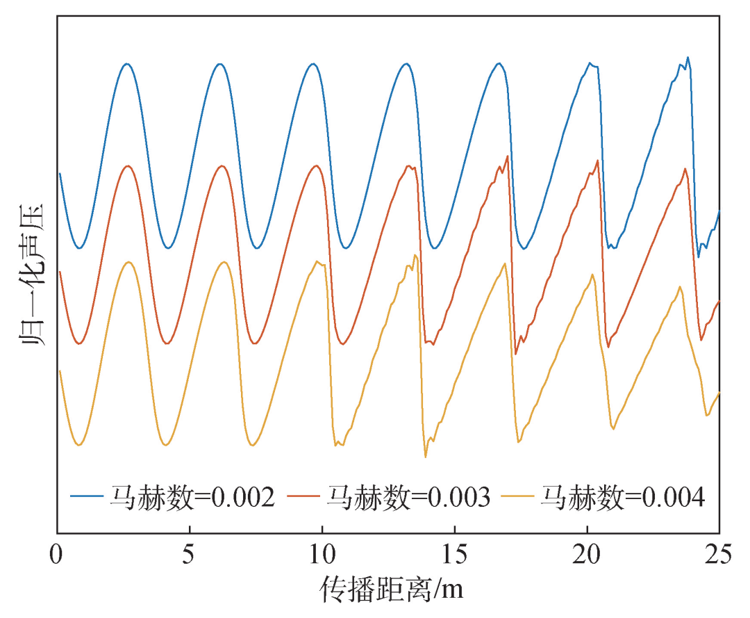 图1 空气中声压级为 140 dB、频率为 1000 Hz 的声波随着传播距离的增加发生了非线性畸变