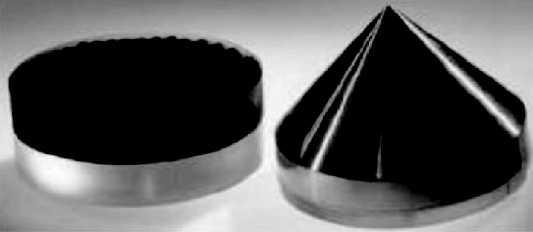 其中,是声波的能量密度。在测量中,将全反射靶或吸收靶放置于水中声场里感知声能流,并用天平来精确测量此时靶受到的声辐射力。最后,将声辐射力换算成声功率即得到最终的测量结果。图14给出了利用全吸收靶和全反射靶测量声功率的实验装置示意图。全反射靶和全吸收靶的主要区别在于靶的结构特性不同。全反射靶通常是用薄金属皮制成的中空凸圆锥体,其锥角为90°,它能将接收到的超声波能量几乎完全反射回去。全吸收靶的表面则是由许多锯齿形吸声尖劈排列而成,从而能够吸收绝大部分的声能量。图15显示了两种靶的实物照片。对于全吸收靶测量而言,声功率和辐射天平的读数满足关系= ,其中是测量当地的重力加速度;对于全反射靶测量而言,上述关系变为= /(2cos),其中是声束在圆锥形全反射靶上的入射角。当然,在声吸收不可忽略时,我们还应当计及声波在水中的吸收声衰减。