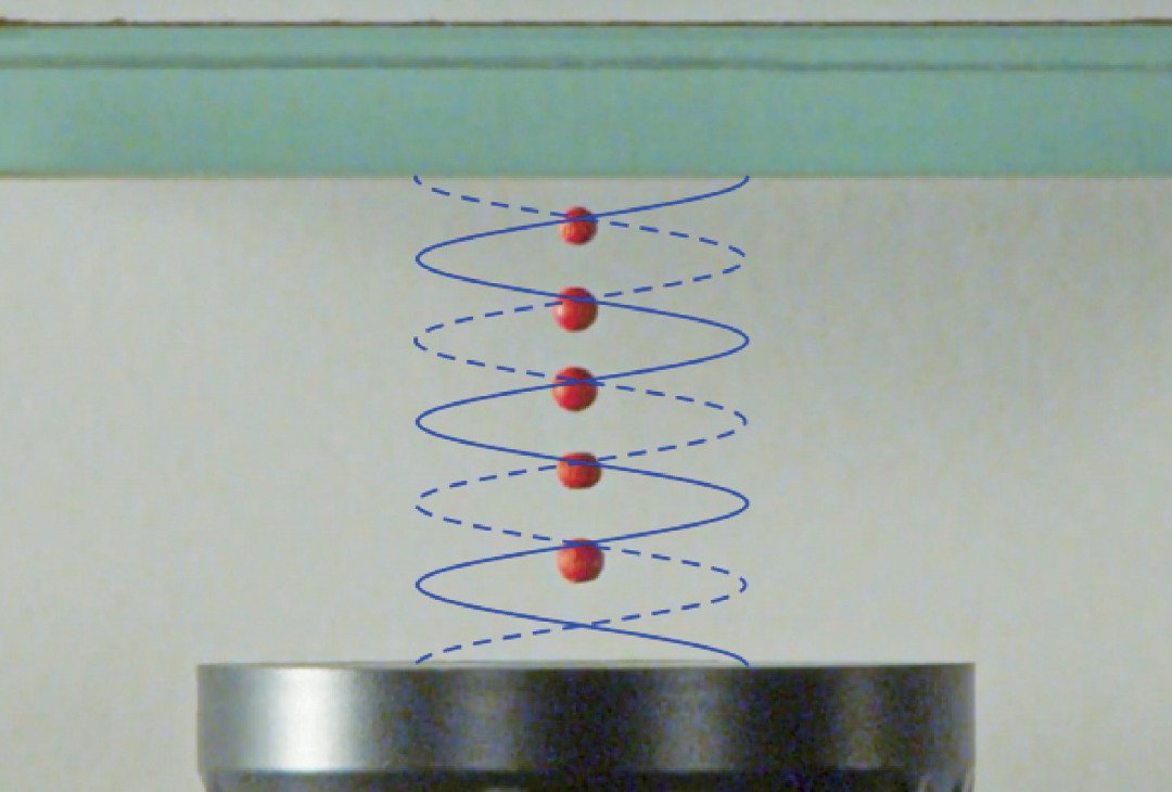 声悬浮技术中最关键的两点是悬浮位置和悬浮能力 ,我们以最简单也是最常见的单轴式声悬浮系统为例作一简单说明。在稳定的一维驻波场中,声压的波节位置对应着时间平均势函数的极小值点,也是声辐射力取零值的位置。当不考虑微小粒子的重力时,粒子将稳定悬浮于驻波场的波节处。在考虑粒子重力的情况下,必须借助一定的声辐射力来克服自身的重力,此时的稳定平衡位置将会稍稍偏离驻波场的波节,如图3所示。有必要指出,声辐射力是一个瞬时变化的物理量,这里的声辐射力取零是时间平均的效果。由于声波一个周期的时长很短,我们肉眼根本观察不到小球瞬时的快速振动,而只能看到其运动的平均效应,从而认为其在声场中保持稳定的平衡。悬浮能力主要体现为该系统可以悬浮物体的最大密度。为了提升悬浮能力,往往需要增加发射换能器的声压振幅,并对发射端和反射端进行相应的优化设计。此外,当谐振模式较低,声压波节较少时,悬浮能力也会得到一定的增强。2002年,西北工业大学解文军等人成功实现了对地面上密度最大的固体铱和密度最大的液体汞的稳定声悬浮(图4),从而证明了原则上可以对地面上的任意物质进行声悬浮。该课题组还利用声悬浮装置进行了液滴物性参数的非接触反演测量研究,包括密度、粘性系数、表面张力和比热等,并对悬浮液滴的动力学行为进行了理论计算与实验观测。