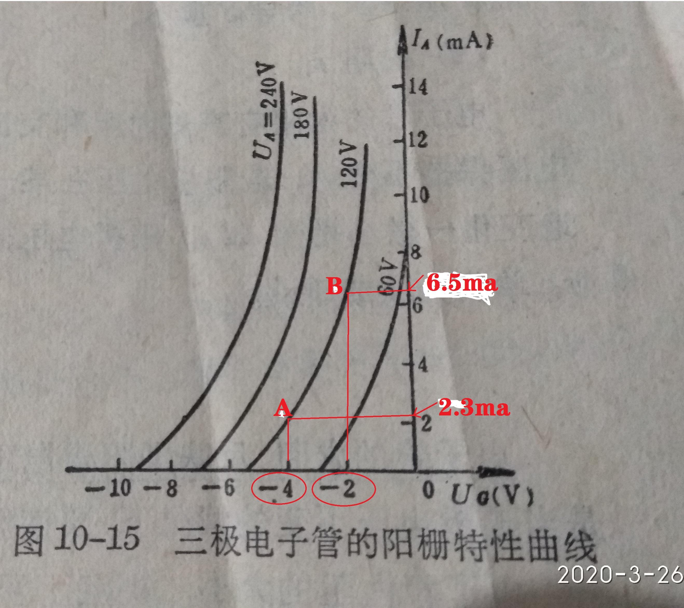 以这一个三极管特性曲线为例:A和B两个点栅极负压从-2伏变化到-4伏,其阳极电流就从6.5毫安减小到2.3毫安。可以计算如下;