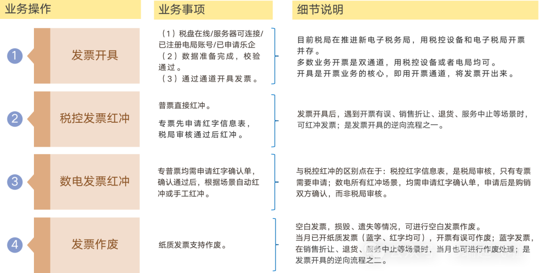 数据准备完成后,可以发起正向或逆向的发票开具服务 ,包括开票、红冲、作废等,相关的主要业务操作包括: