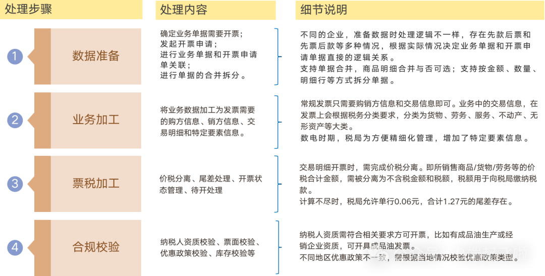业务数据,时常跟税局要求的开票数据有出入,在准备开票前,需要进行业务加工 ,将业务数据加工为发票需要的购方信息、销方信息、交易明细和特定要素信息。