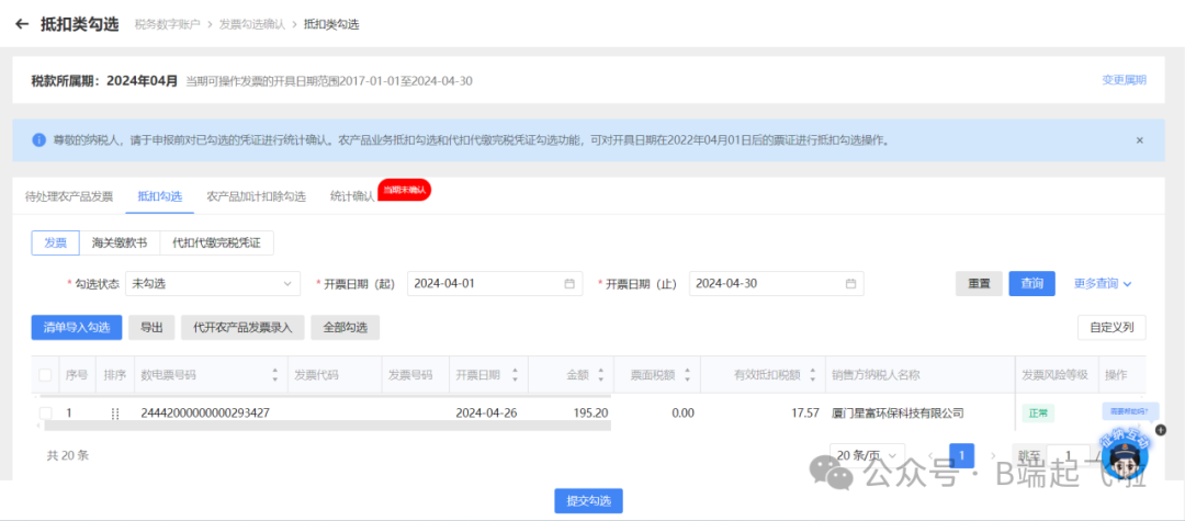 选择可勾选的票据,确认无误后,提交相关数据到税局,进行勾选抵扣。