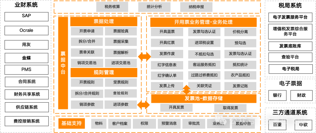 票据中台负责连接外部系统,业财系统需要开票时,可将数据传入票据中台,通过票据中台的票据处理和规则处理,形成标准的开票和用票数据,进入开用票业务处理模块,进行发票开具或发票勾选抵扣等业务处理。最终所有开具发票和取得发票均在发票池中存储,以备各个系统及模块调用和分析。